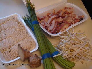 Voilà les ingrédients pour cette recette:nouilles au oeufs fraîches de style Cantonais,ciboulette de chine,gingembre,fèves germées(germes de soja)